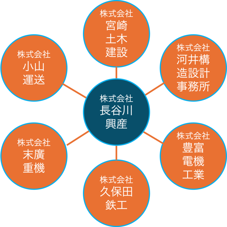 グループに上下関係はなく、全ての企業が独立性を持ちながら連携しています。中核企業となる長谷川興産は、経営企画および卸売事業を行うことでグループ企業の販売面での役割を担っており、グループ各社は特徴的な生産部門・ライン部門を有しています。各社のシナジー効果を最大化させることで、より大きな社会的責任を果たすことを目指しています。