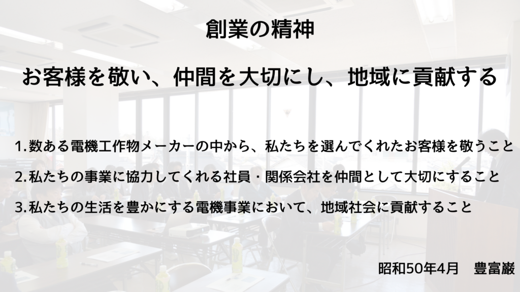 「創業の精神」は、創業者である豊富巌が会社設立時(昭和50年4月)に定めた当社の精神を表すものです。